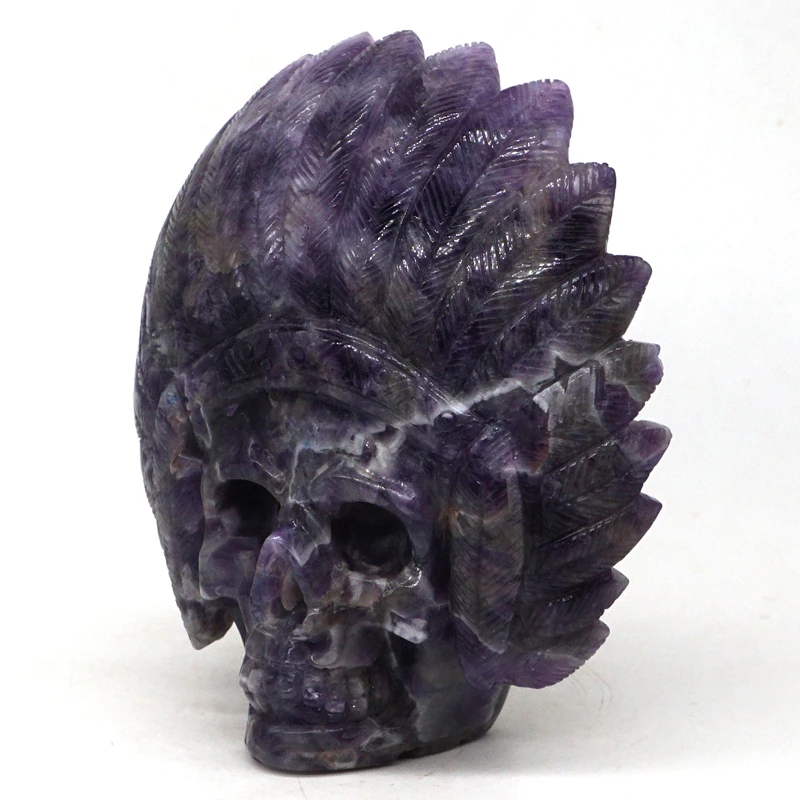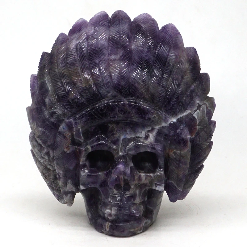 TOP Indians Skull Figurine 4.8" Natural Gemstone Amethyst Crystal Carved Stone Statue Home Decor