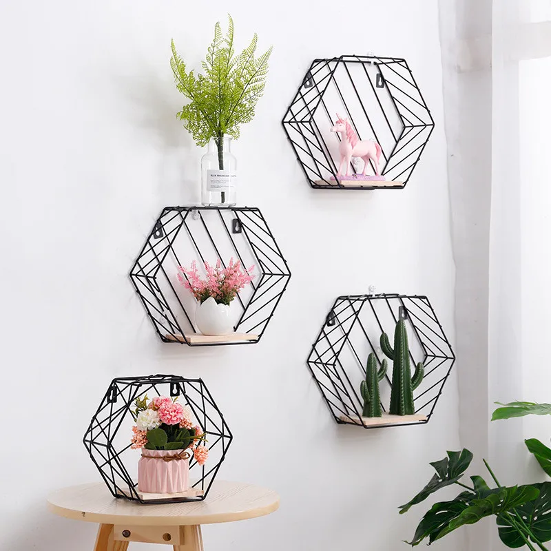 BEST Nordic Hexagon Shelf Metal Wooden Wall Decor Hanging Rack Strip Holder Home Wall Decoration Storage
