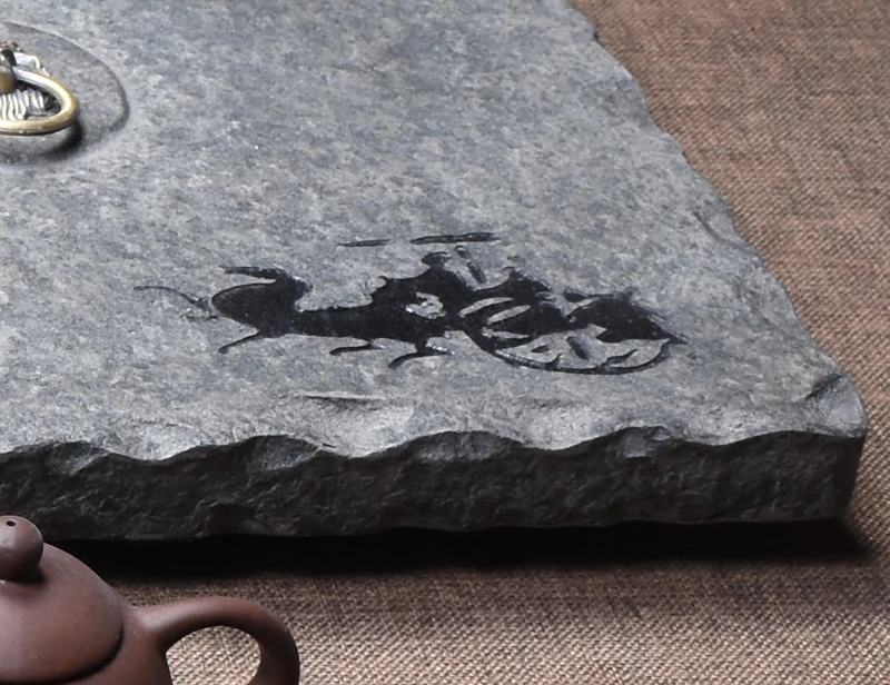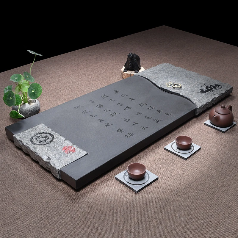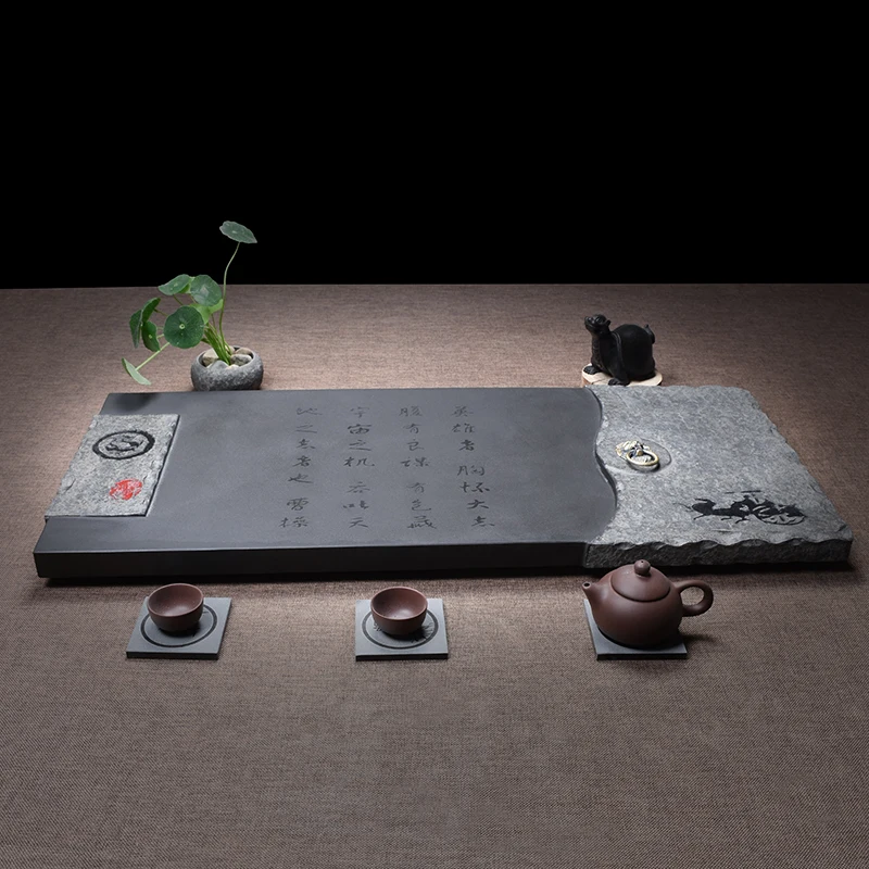 black stone tea tray heavy calligraphy engraved tea table weighted water draining tea boat serving