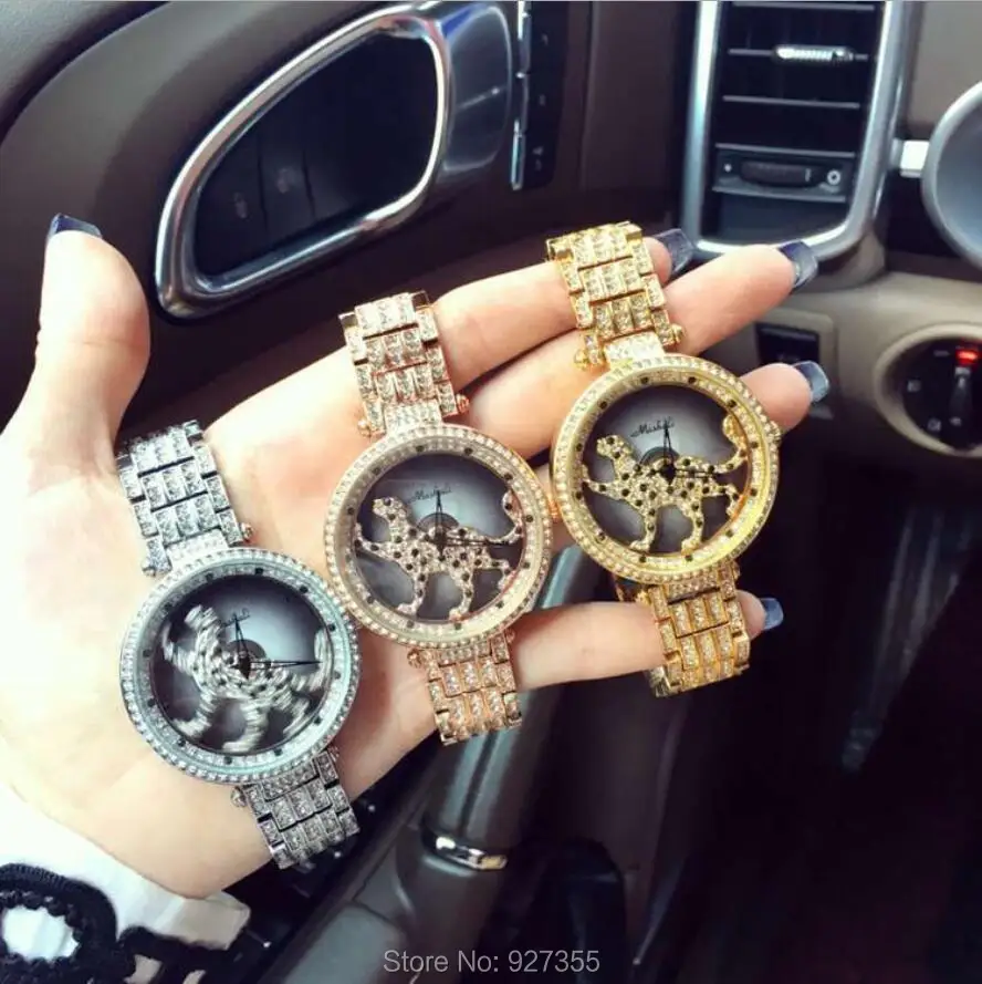Hot Sale 3 Colors Women Watch Stainless Steel Watches Lady leopard Rotation Dress Watch Big Diamond Stone Wr